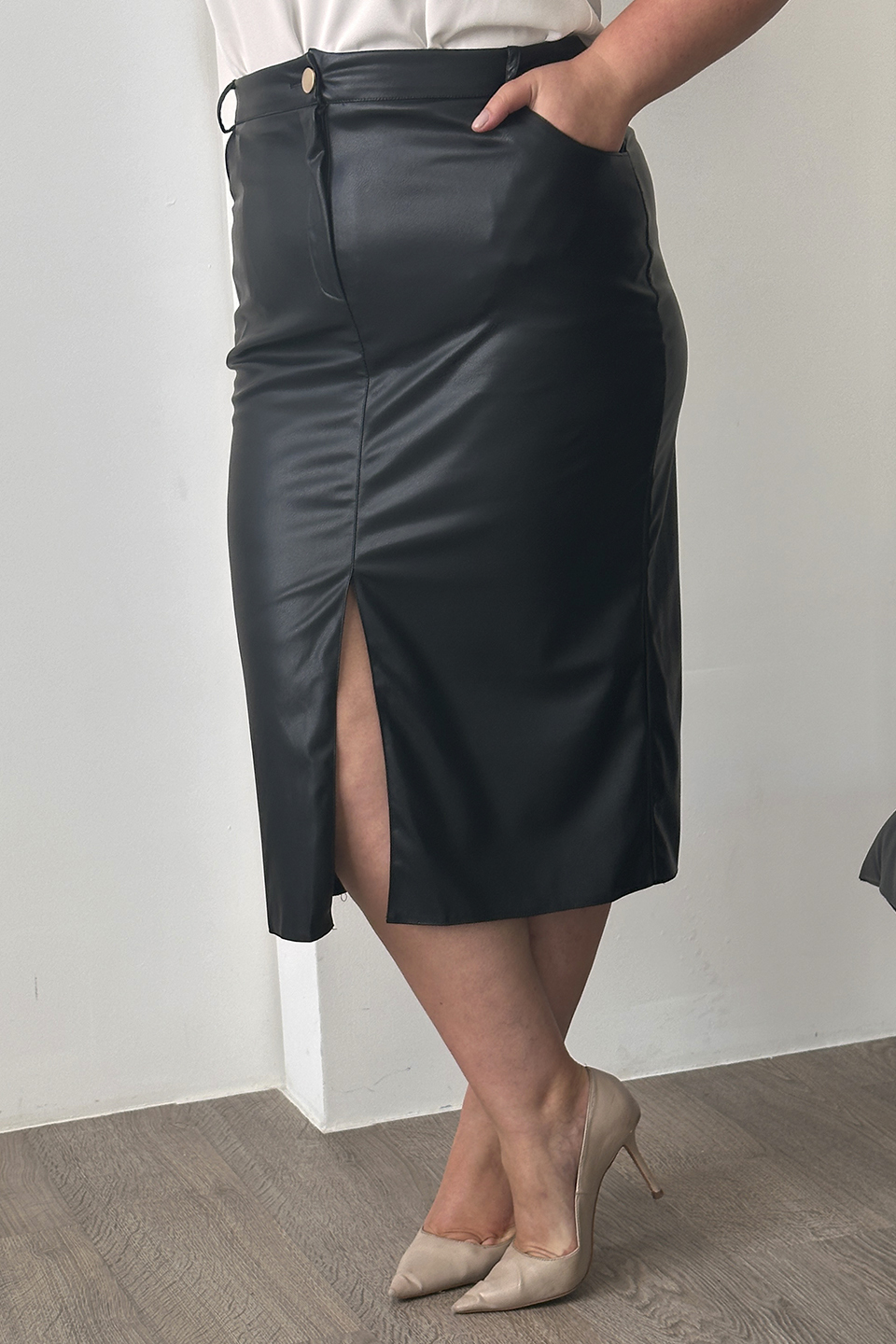 Юбка искусственная кожа с разрезом спереди черная