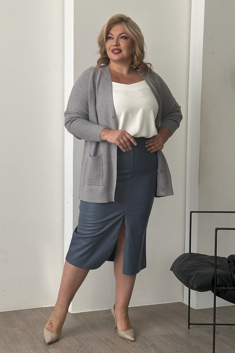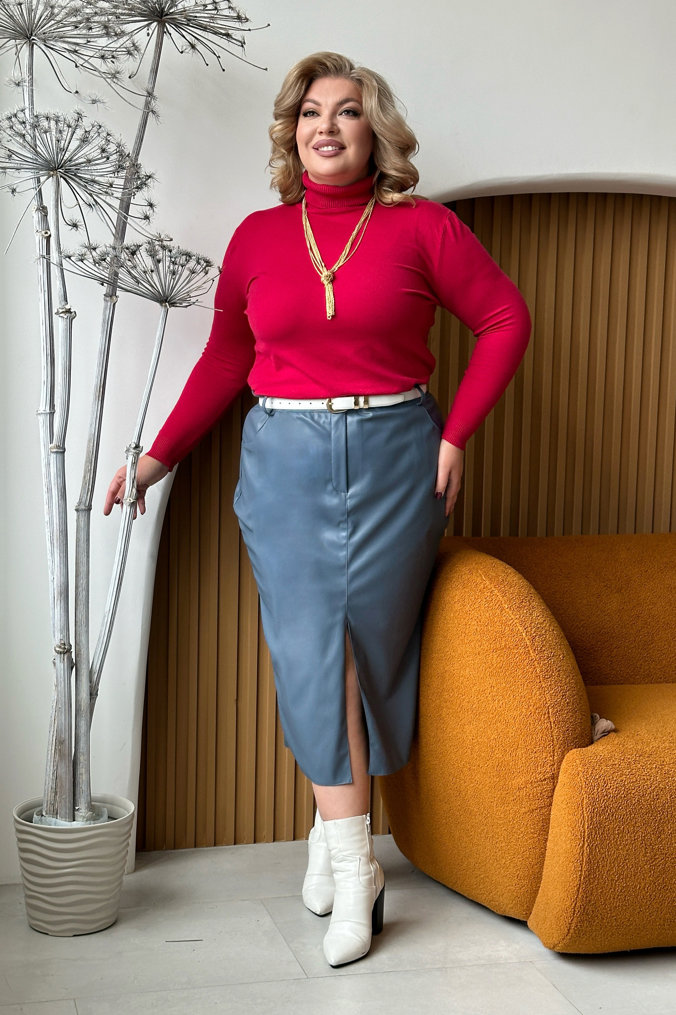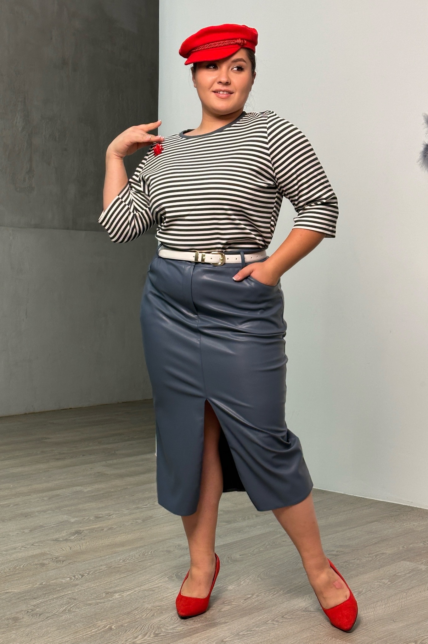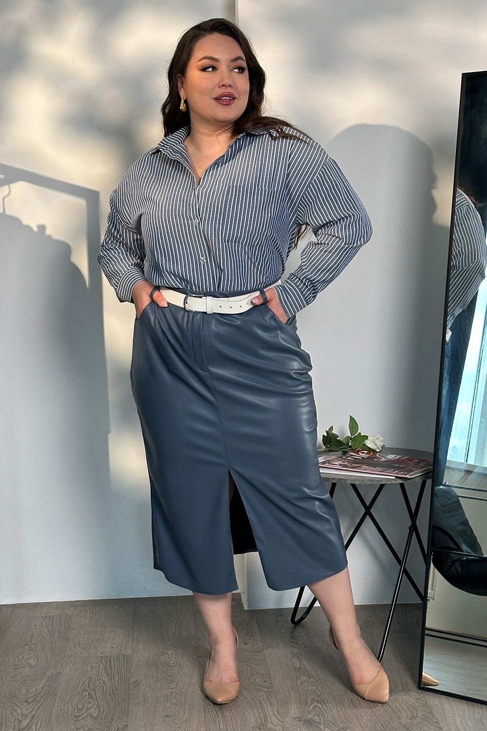 Стильная юбка из мягкой экокожи подчеркнет достоинства женской фигуры. притачной пояс со шлевками способствует оптимальной посадке по фигуре. декоративный шов по переду переходит в небольшой кокетливый разрез, что зрительно вытягивает силуэт. модель привлекает стильным дизайном. прямой крой не сковывает движений и искусно обыгрывает бедра. всесезонная, практичная модель отлично структурирует и собирает фигуру в проблемных местах за счет плотности ткани. носить юбку такого плана можно с любимыми свитерами, обтягивающими водолазками, блузами и рубашками.
