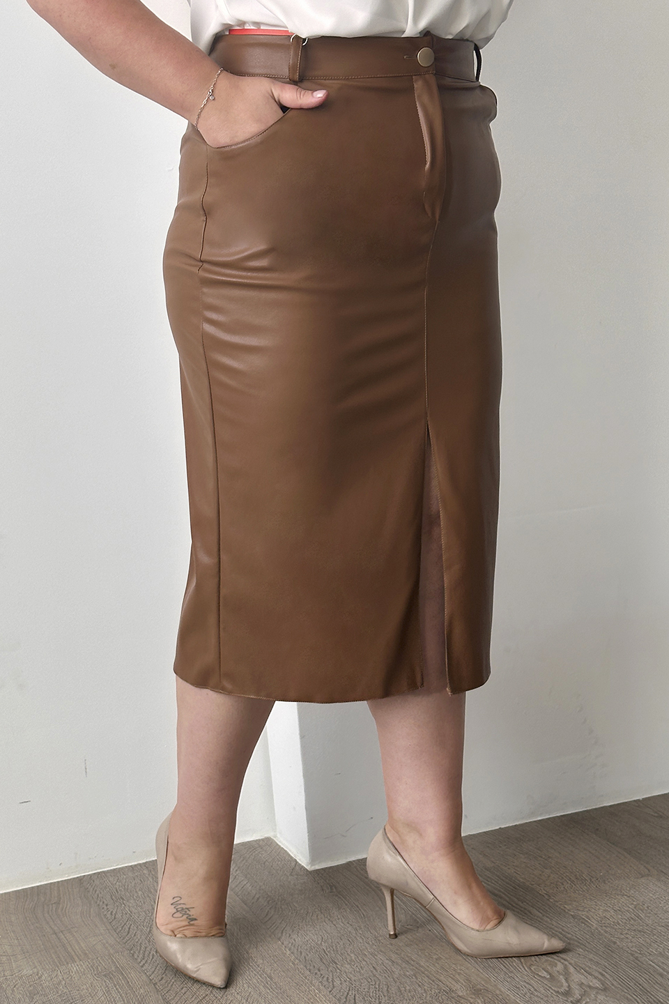 Юбка искусственная кожа с разрезом спереди коричневая