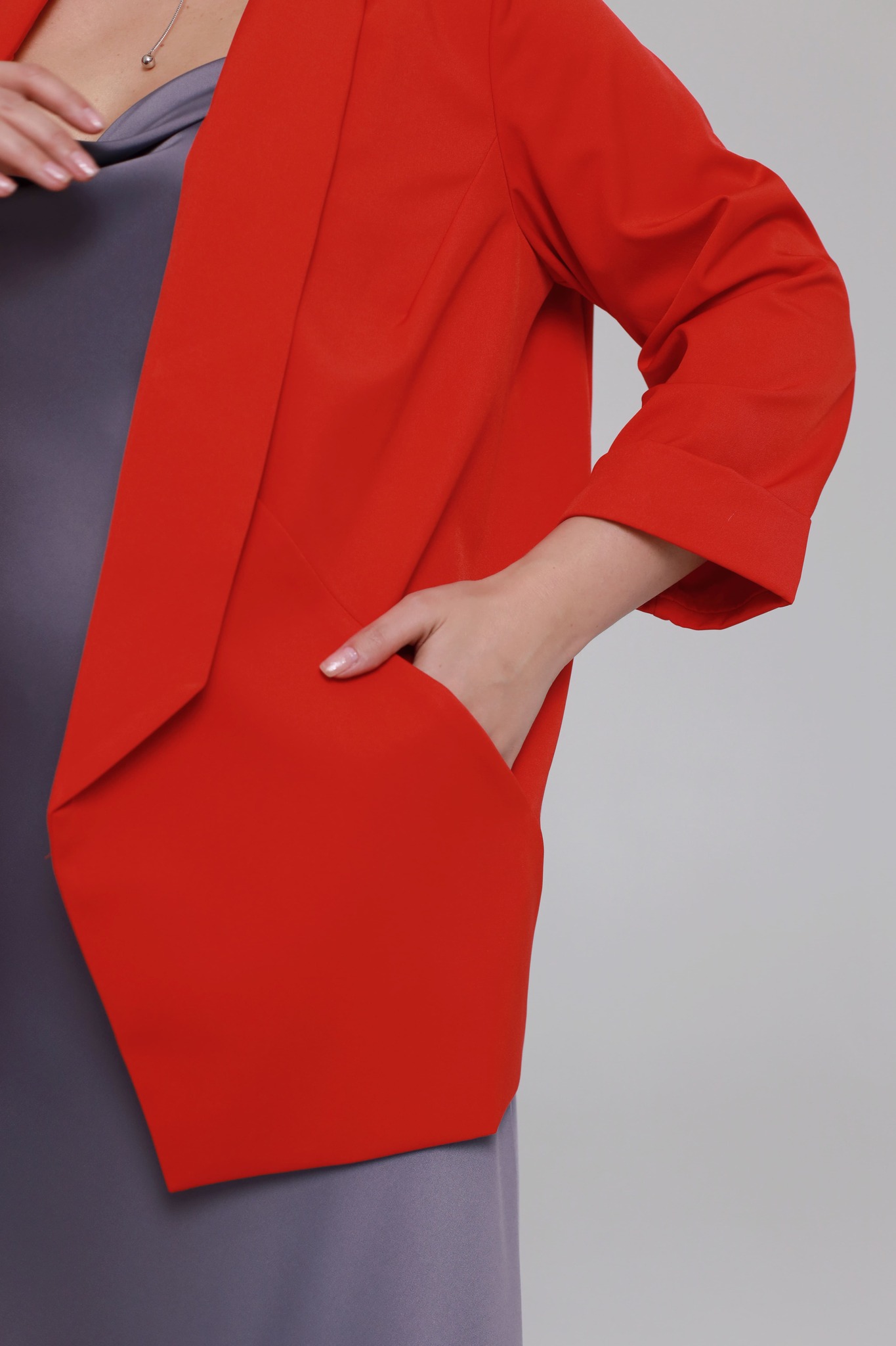 Женственный жакет прямого кроя. выполнен из плотной мягкой ткани. глубокий v-образный вырез оформлен отложным воротником. рукава 7/8 оформлены отворотом. по бокам вшивные карманы. формирующие швы обеспечивают оптимальную посадку по фигуре. небольшие подплечники делают осанку более выправленной. передние полочки дополнены атласной подкладкой, по спинке подкладка отсутствует. ассиметричный нижний край спереди – визуально стройнит. модель полуприлегающего силуэта без застежки - отлично подходит для завершения стильного образа.