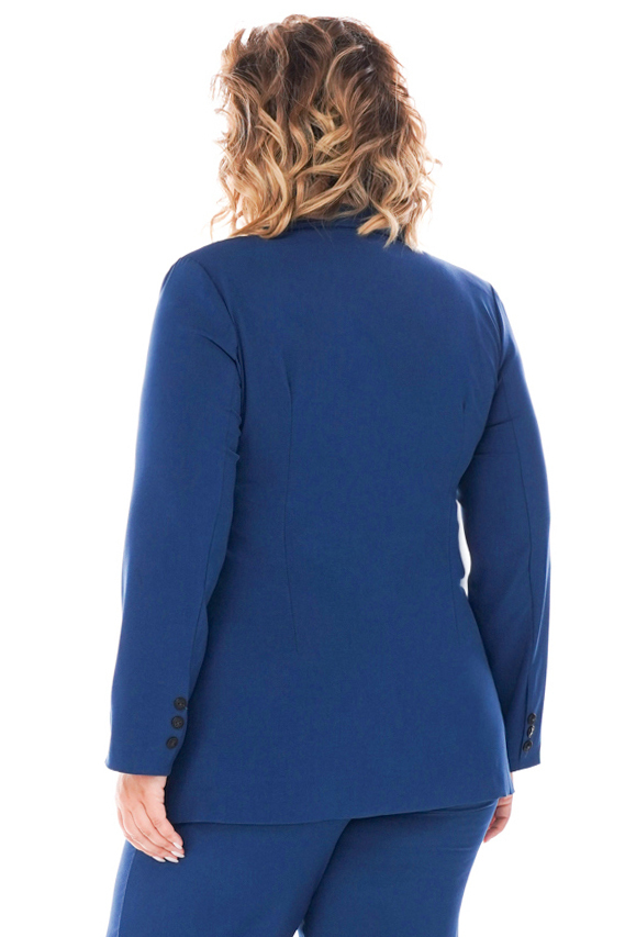 Стильный жакет прямого кроя из мягкого материала. v-образный вырез оформлен классическим отложным воротником с лацканами. передние полочки дополнены атласной подкладкой, по спинке подкладка отсутствует. рукава полной длины украшены декоративными пуговками. аккуратные подплечники зрительно вытягивают силуэт и делают бедра визуально у же. вытачки на груди и по спинке способствуют оптимальной посадке по фигуре. модель на двубортной застёжке, что добавляет модели практичности и оригинальности. по бокам декоративные клапаны. этот модный жакет станет идеальным дополнением для повседневного стильного образа.