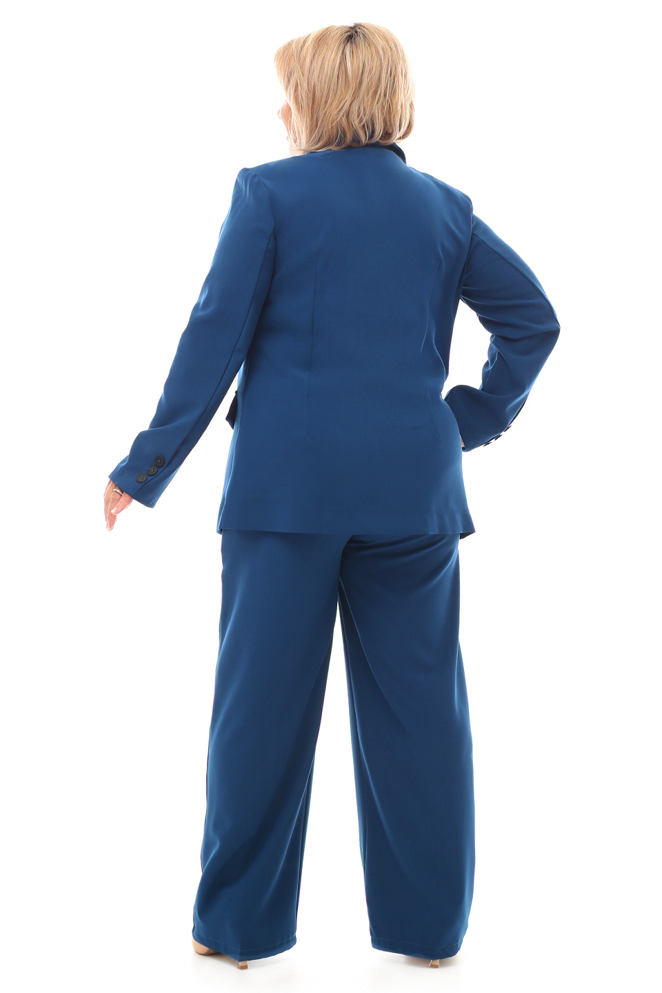Стильный жакет прямого кроя из мягкого материала. v-образный вырез оформлен классическим отложным воротником с лацканами. передние полочки дополнены атласной подкладкой, по спинке подкладка отсутствует. рукава полной длины украшены декоративными пуговками. аккуратные подплечники зрительно вытягивают силуэт и делают бедра визуально у же. вытачки на груди и по спинке способствуют оптимальной посадке по фигуре. модель на двубортной застёжке, что добавляет модели практичности и оригинальности. по бокам декоративные клапаны. этот модный жакет станет идеальным дополнением для повседневного стильного образа. длина изделия 50 размера по спинке - 67 см. в каждом следующем размере длина увеличивается.