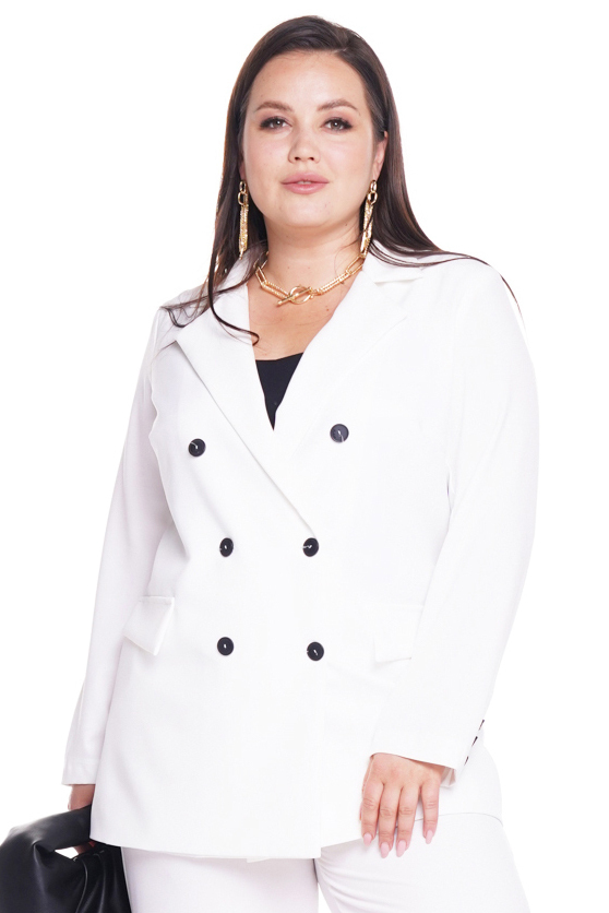 Стильный жакет прямого кроя из мягкого материала. v-образный вырез оформлен классическим отложным воротником с лацканами. передние полочки дополнены атласной подкладкой, по спинке подкладка отсутствует. рукава полной длины украшены декоративными пуговками. аккуратные подплечники зрительно вытягивают силуэт и делают бедра визуально у же. вытачки на груди и по спинке способствуют оптимальной посадке по фигуре. модель на двубортной застёжке, что добавляет модели практичности и оригинальности. по бокам декоративные клапаны. этот модный жакет станет идеальным дополнением для повседневного стильного образа. длина изделия 50 размера по спинке - 67 см. в каждом следующем размере длина увеличивается.