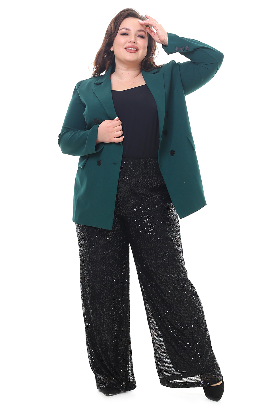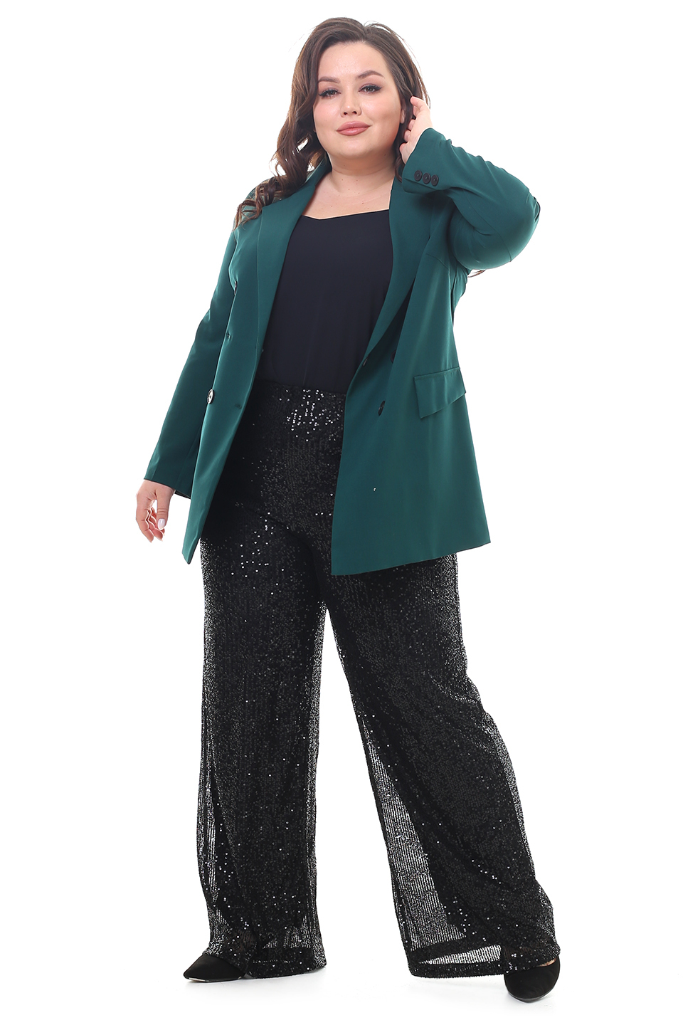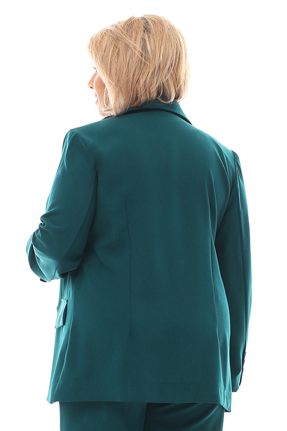 Стильный жакет прямого кроя из мягкого материала. v-образный вырез оформлен классическим отложным воротником с лацканами. передние полочки дополнены атласной подкладкой, по спинке подкладка отсутствует. рукава полной длины украшены декоративными пуговками. аккуратные подплечники зрительно вытягивают силуэт и делают бедра визуально у же. вытачки на груди и по спинке способствуют оптимальной посадке по фигуре. модель на двубортной застёжке, что добавляет модели практичности и оригинальности. по бокам декоративные клапаны. этот модный жакет станет идеальным дополнением для повседневного стильного образа. длина изделия 50 размера по спинке - 67 см. в каждом следующем размере длина увеличивается.