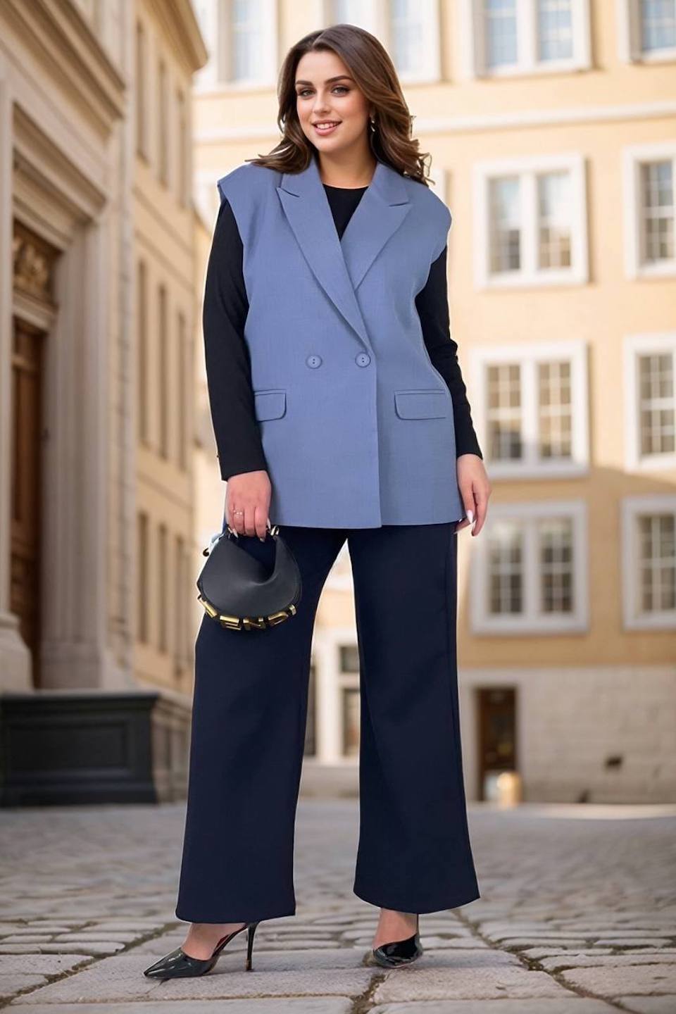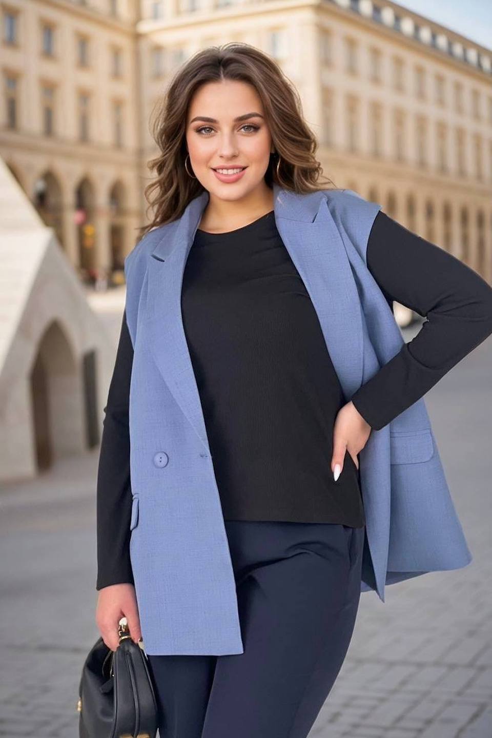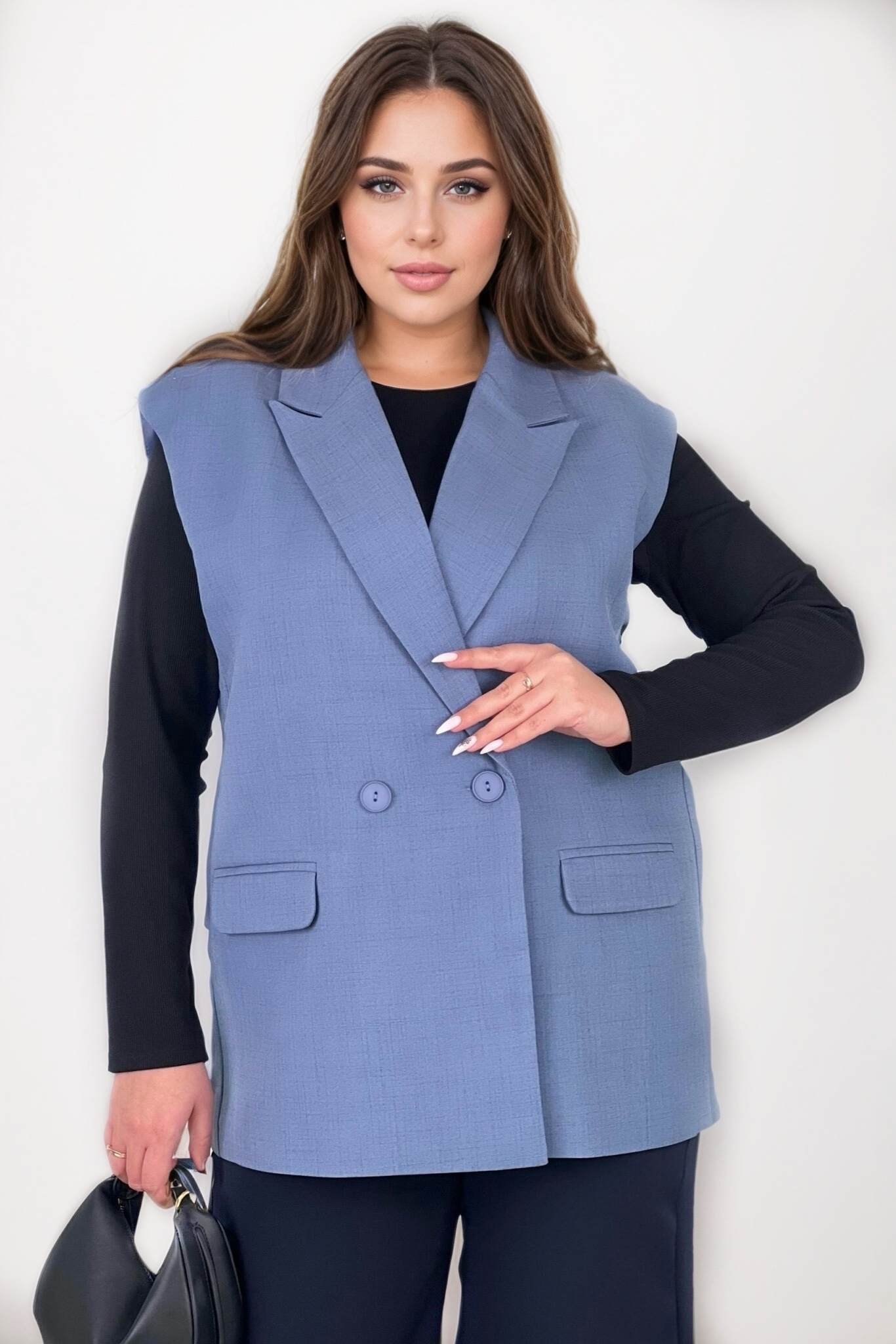 Двубортный жилет прямого кроя на подкладке из мягкого материала. глубокий v-образный вырез оформлен отложным воротом с лацканами. по бокам прорезные карманы с клапанами. центральный шов по спинке и вытачки на груди обеспечивают оптимальную посадку по фигуре. благодаря достаточно свободному силуэту, модель комфортно сидит и не сковывает движений. отлично сочетается с легкими брюками и рубашками в качестве элегантного офисного костюма. прием многослойности помогает интересно и стильно обыграть базовые вещи.