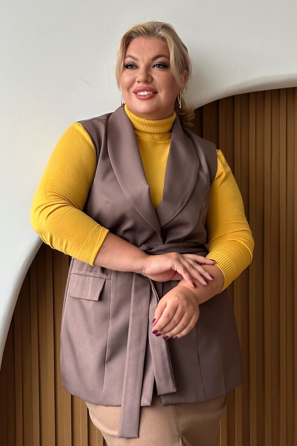 Женственный жилет прямого кроя на подкладке. глубокий v-образный вырез оформлен отложным воротом. модель застегивается на пуговку. объемные прорезные карманы оформлены клапанами. центральный шов по спинке и диагональные вытачки на груди обеспечивают оптимальную посадку по фигуре. талию, по желанию, можно обозначить съемным поясом в тон. благодаря достаточно свободному силуэту, модель комфортно сидит и не сковывает движений. отлично сочетается с легкими брюками и рубашками в качестве элегантного офисного костюма. прием многослойности помогает интересно и стильно обыграть базовые вещи.